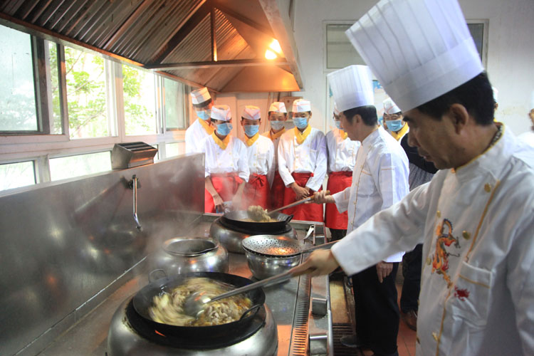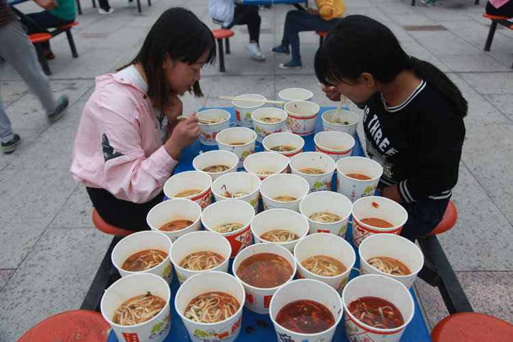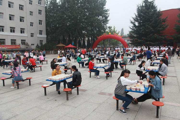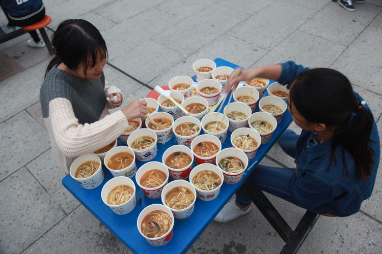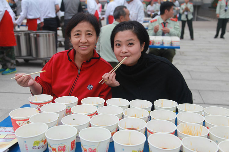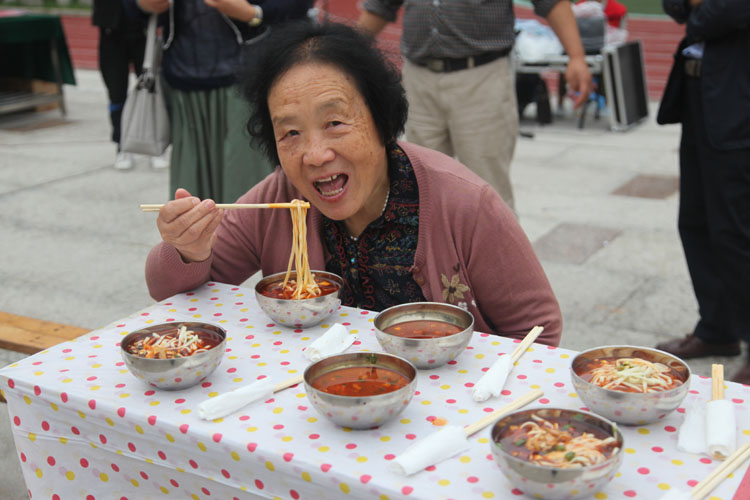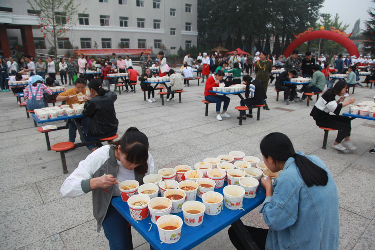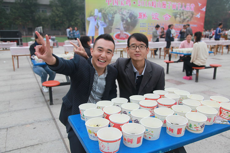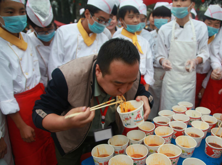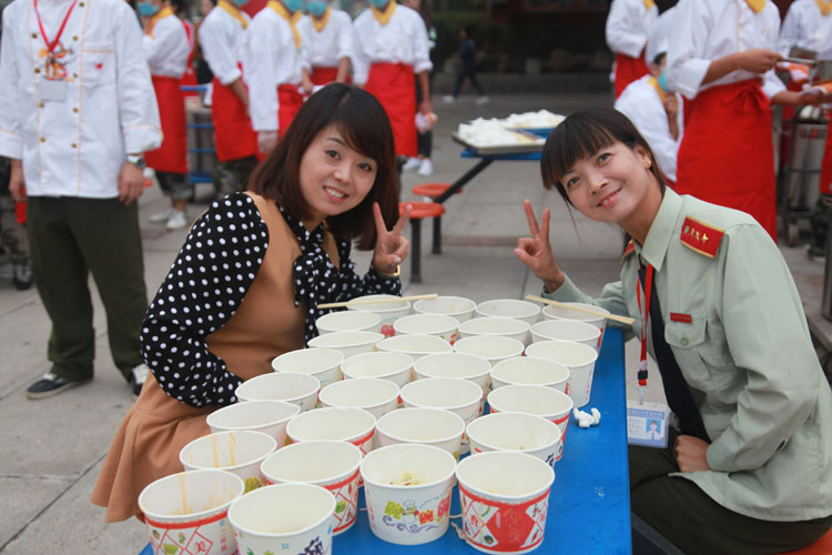 品赏联谊会上,宝鸡市饮食服务行业协会名厨专业委员会的名厨们,现场为参会的人们传授了岐山臊子面制作技术。该校师生及社会人士千余人参加了观赏臊子面制作工艺、品尝臊子面美味活动。同时,还举行了“百人大胃王咥面赛”,参加比赛的有学生、有老师,也有社会各界人士。将100人按照每桌两人,分成50桌,每人15碗臊子面,每桌有人专门计时,每桌第一名产生后,后面的人不再计时,最终,从10桌里面的第一名们按时间排出名次。要求吃面的同时也可以喝汤,但是面条必须吃完。比赛现场,加油声、掌声、笑声不断。经过激烈角逐,最终陕西三和职业中等专业学校代表老师李都都以65秒吃了15碗面的成绩,获得“大胃王咥面冠军”。
