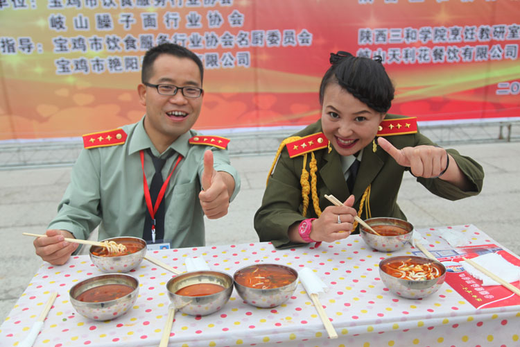 岐山臊子面又叫“浇汤面”,是在周代的“蛟龙汤面”和唐代的“长命面”基础上发展延绵而来。据历史记载,岐山臊子面于明代盛名关中,文明海内外,誉为岐山地方风味名吃。如今岐山臊子面伴随着改革开放的春风色愈浓,香愈远,已成为陕西饮食文化的一种重要载体,在我国俗食文化中具有极其重要的地位,已被列入全国非物质文化遗产名录。为贯彻落实宝鸡市“最中国美食城建设”工作的需要,结合行业实际,由宝鸡市饮食服务行业协会、陕西三和教育集团、岐山臊子面行业协会共同策划举办的“千人品尝中国宝鸡美食岐山臊子面及百人吃面大比拼”活动。