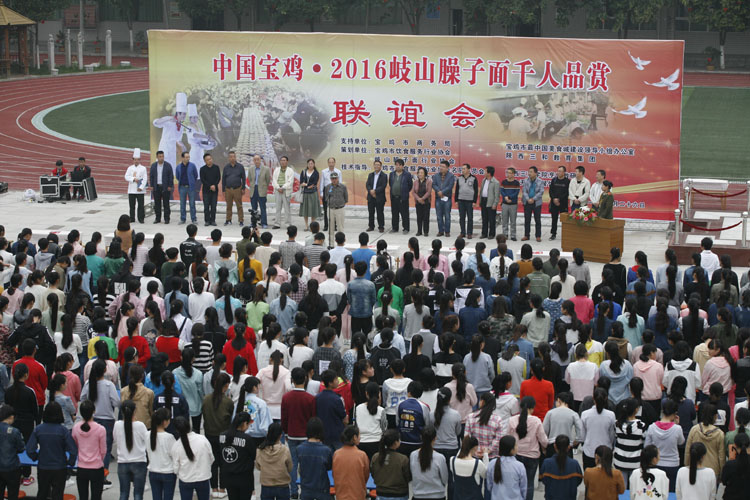 为了进一步扩大岐山臊子面品牌影响,弘扬周秦饮食文化,传承西岐传统美食手工技艺,促进相关从业人员之间的相互沟通、学习、进步,2016年9月26日上午10时许,“中国·宝鸡2016岐山臊子面千人品赏联谊会”在陕西三和职业中等专业学校举行。展示以陕西三和职业中等专业学校烹饪专业学生为代表的传统技艺继承主力军的担当精神和娴熟技艺,以陕西三和职业中等专业学校作为烹饪基地,传播、发扬、推广西府名小吃,开展特色名小吃培训班,让西府小吃名扬天下、享誉全国,全面推进臊子面配方科学化、标准化、大众化,推动宝鸡臊子面市场发展,不断提高市场占有率,将岐山臊子面带向五大洲,更将饱含其中的礼乐文化底蕴和中华先民原始朴素的哲学理念传遍世界。