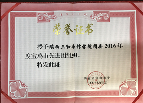 学校团委荣获2016 年度宝鸡市先进团组织,陕西三和职业中等专业学校团委是宝鸡民办院校唯一获此殊荣的团组织。