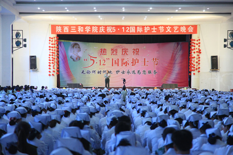 5月12日晚7时,庆祝晚会在庄严神圣的“授帽仪式”中拉开帷幕,在学校大礼堂,三和教育集团董事长王建民同志携宝鸡永康亚健康医院、宝鸡颐养康复医院的领导和员工,和全体师生欢聚一堂,共同庆祝5.12国际护士节。学校工会杨主席发表了热情洋溢的致辞,代表学校领导向平凡岗位上辛勤工作和无私奉献的老师们表示最崇高的敬意,向怀揣“天使”梦想的学生表示节日的祝贺。希望白衣天使们能向现代护理事业的创始人南丁格尔无私奉献,努力践行“燃烧自己、照亮别人”的人道主义精神。全心全意为人民服务为宗旨,履行护士的天职,以自己的真心、爱心、责任心对待未来每一位病人,激励同学们要塑造高尚的职业道德修养,努力学习专业知识,掌握过硬的临床技能,做一名合格的护理人才。