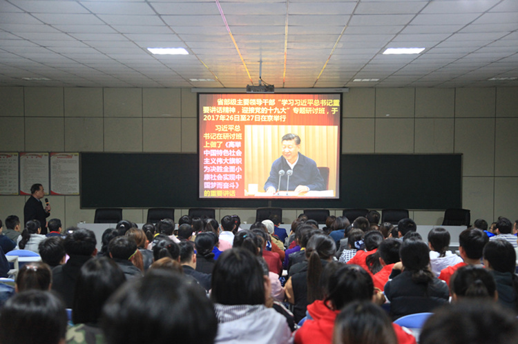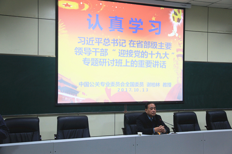 2017年10月13日晚上6:30—8:00,学校全体教职员工、学生干部代表在一号演讲厅参加由学校终身顾问谢柏林教授主讲的《习近平总书记在省部级主要领导干部"迎接党的十九大专题研讨会上的重要讲话》讲座。