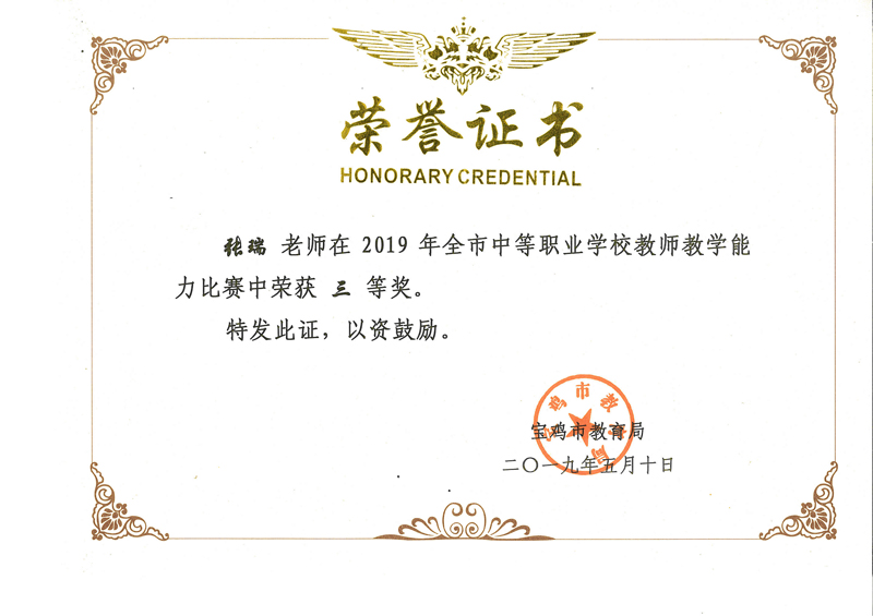 在2019年5月,宝鸡市举办的中等职业学校教师教学能力比赛中,我校张瑞、马慧、赵亚艳三位老师荣获三等奖。