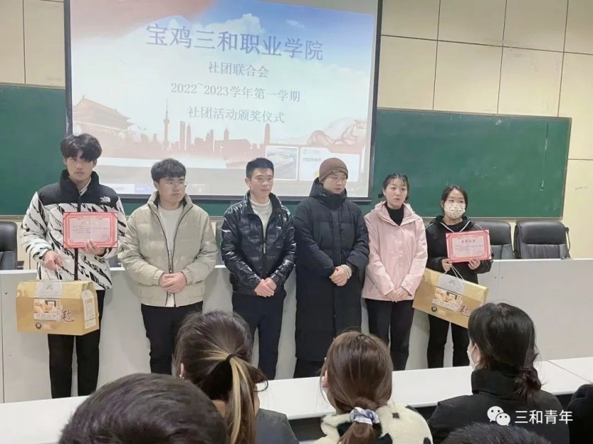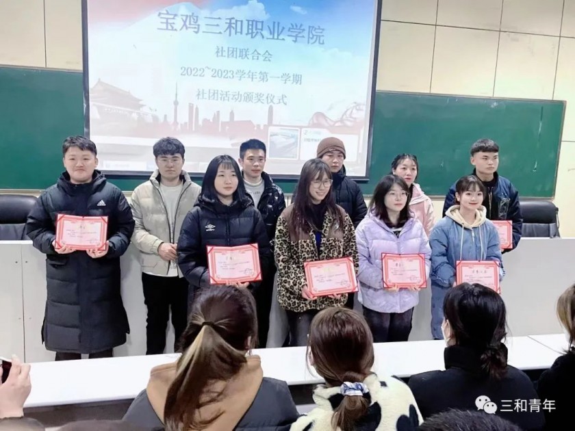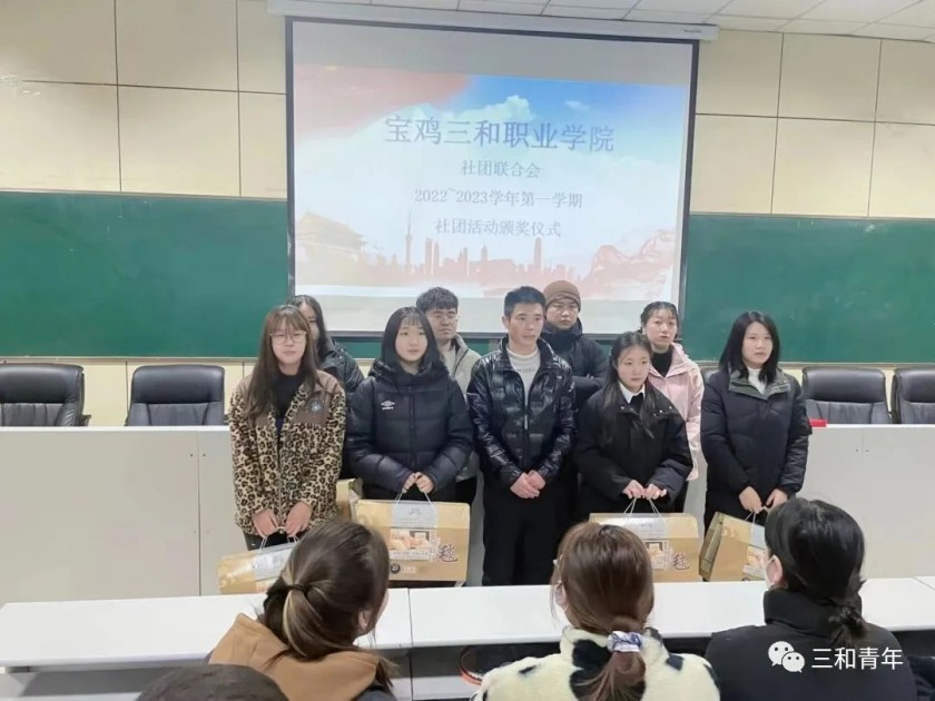 12月06日19:00,我校社团联合会于一号演讲厅举行2022~2023学年第一学期社团活动颁奖仪式,活动由校团委书记贺苗老师主持,校党支部书记杨宏民、各社团辅导老师和各社团成员及获奖学生参会。