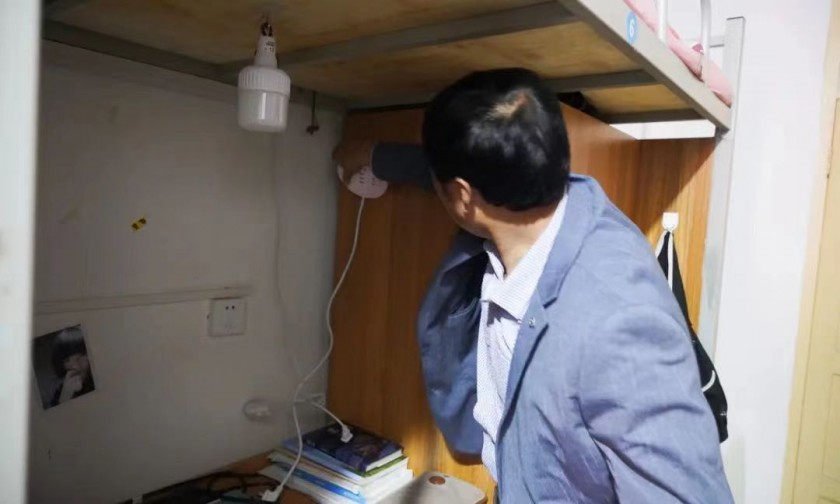 为认真贯彻省委教育工委和教育厅关于做好高校安全稳定工作的有关要求,落实学院“双整双改”教育活动精神,加强学生宿舍用电安全管理,提高学生的安全用电意识,消除宿舍安全隐患,维护校园安全稳定,5月23日上午,根据学院的统一部署,学生处张文刚处长带领辅导员及公寓管理科等相关人员,对学生公寓进行用电安全专项检查。