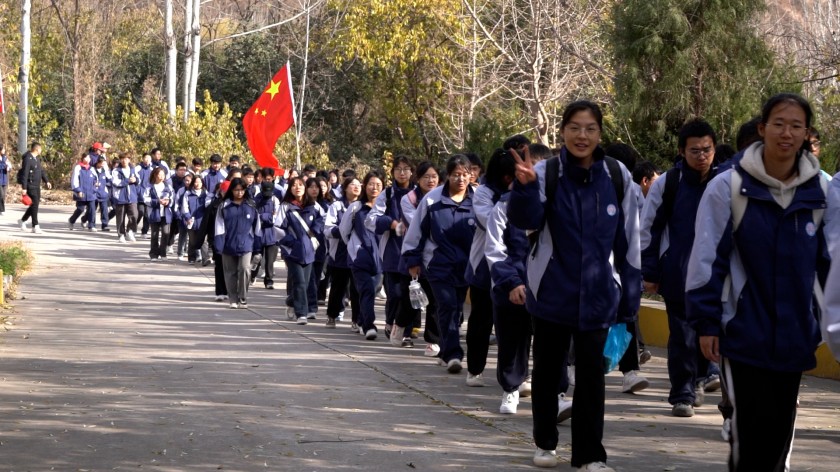 启程:各班班委手持五星红旗,带着青春的气息。全体同学肩并肩,在阳光的沐浴下踏着坚定的步伐向目的地出发。