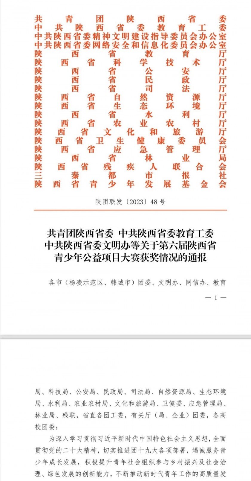 为贯彻落实党的二十大精神和习近平总书记寄语希望工程实施30周年重要精神,深化青少年公益品牌项目,提升青年社会组织参与乡村振兴及基层社会治理能力,不断推动我省青少年公益事业实现科学发展。best365团委积极响应,组织动员best365团员青年积极参与由团省委、省青基会联合省委教育工委、省委网信办、省委文明办、省教育厅、省科技厅、省公安厅、省民政厅、省司法厅、省自然资源厅、省生态环境厅、省水利厅、省农业农村厅、省文化和旅游厅、省卫健委、省应急管理厅、省林业局、省残联、三秦都市报社等共同举办“第六届陕西省青少年公益项目大赛”并荣获佳绩。