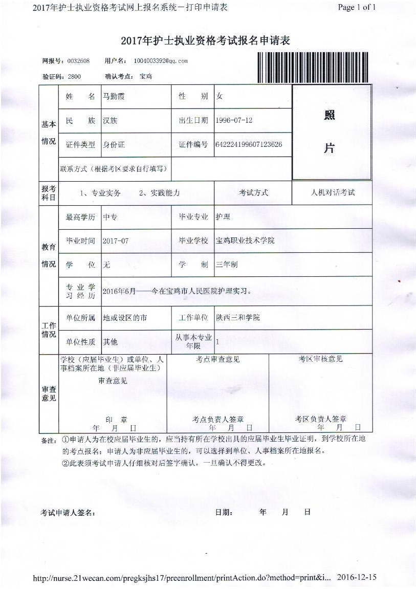 1、报名方式全部采用网上报名。自2016年12月15日起,考生登录“中国卫生人才网”(网址:http://www.21wecan.com),在网上准确无误地填写个人报名信息,并打印《2017年护士执业资格考试申请表》