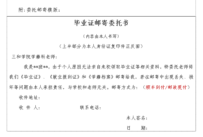 3.因特殊原因实在不能到校领取者,可委托老师邮寄,邮寄过程中出现的丢失及损坏问题由本人自行负责。办理程序为:学生向负责老师提交邮寄委托书(详见通知后模版),邮寄方式分为到付(顺丰速递)和现付(邮政快递邮费12元)两种,同学们通过微信将委托书和邮费发给负责老师。