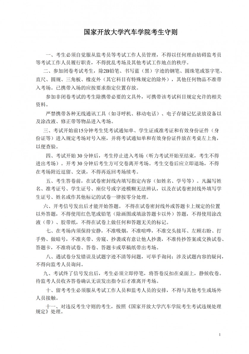 三、遵守考试纪律。没有规矩,不成方圆。国家开放大学的前身中央广播电视大学在2005年就对考场纪律做出了明确规定,希望同学们能够在考前认真学习,并在考试时切实践行。特别是要尊重考务人员,接受考务人员对证件的检查,听从考务人员安排,服从监考人员的监督管理。考试时,做到不交头接耳、左顾右盼、传递物品、打手势、做暗号;不偷看、抄袭他人答卷或允许他人抄袭自己的答卷;不夹带,不舞弊。大家共同努力,创造良好的考试环境。